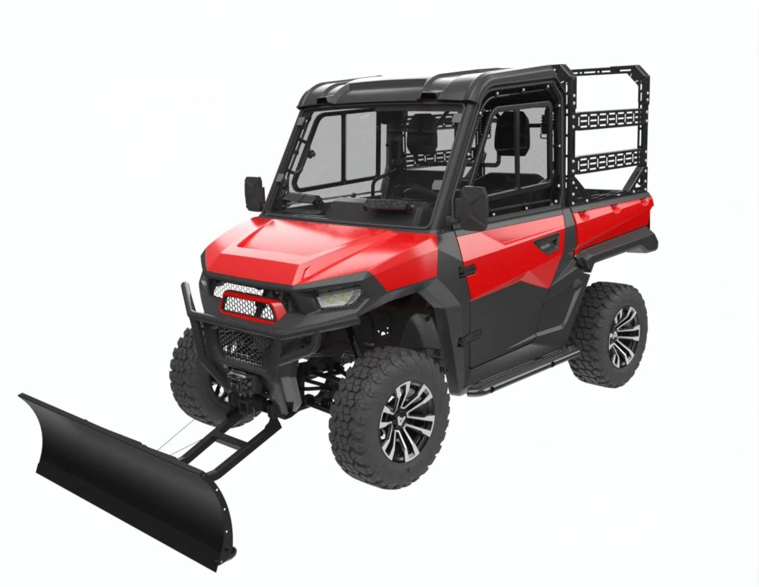 The Ultimate Winter SPV package offers the top line hard poly half doors uppers with tempered glass sliders as well as a hard poly rear window panel with tempered glass sliders for maximum ventilation and access to the rear cargo area. Combined with the standard hard top and front windshield, the hard poly half doors and rear window panel with sliders creates a complete hard cab enclosure with automotive grade weather seals all around. This setup offers draft free comfort in heavier weather conditions with multiple ventilation options, clearer visibility out the poly door windows, and the convenience of slider windows on the doors and rear panel. The dash integrated cab heater has 4 vents in the dash (2 top / 2 bottom) and switch dash has an adjustable fan speed providing a well heated and comfortable cabin in the coldest conditions. The heavy duty adjustable 60-72 inch 3-piece plow is winch operated from inside the comfortable cab. Sidestep Rails with perf metal plates aid with quick sure-footed entry/exit from vehicle and a rear view mirror completes all the mirrors you will need combined with the standard sideview mirrors for full rear and side visibility . The Rear rack provides organized cargo management for shovels, gear and equipment for heavy work applications. A great versatile and stout setup for commercial applications.